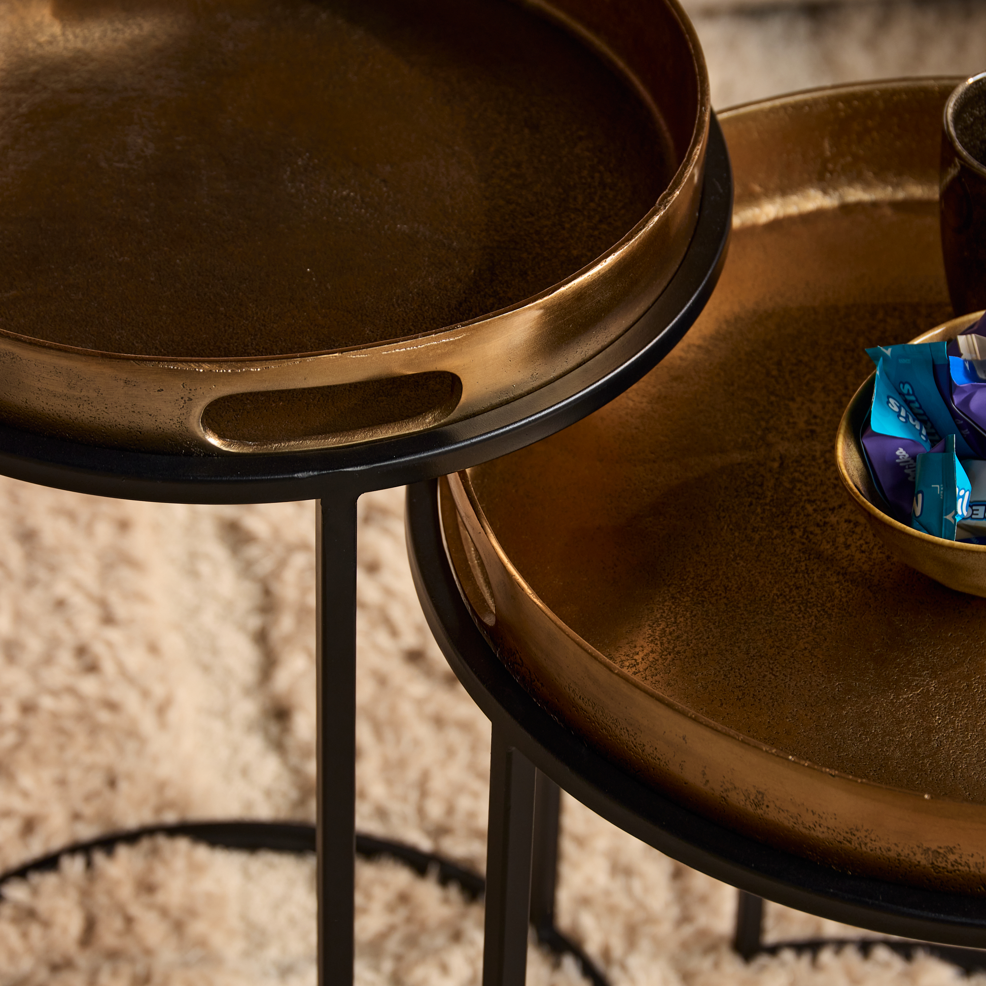 De salontafel Laure van Starfurn bestaat uit twee elegante tafels met aluminium bladen, in een warme koper kleur. Het slanke, zwarte metalen onderstel geeft de tafels een moderne en luchtige uitstraling. Deze set biedt flexibiliteit en stijl, een stijlvolle toevoeging aan elk interieur.