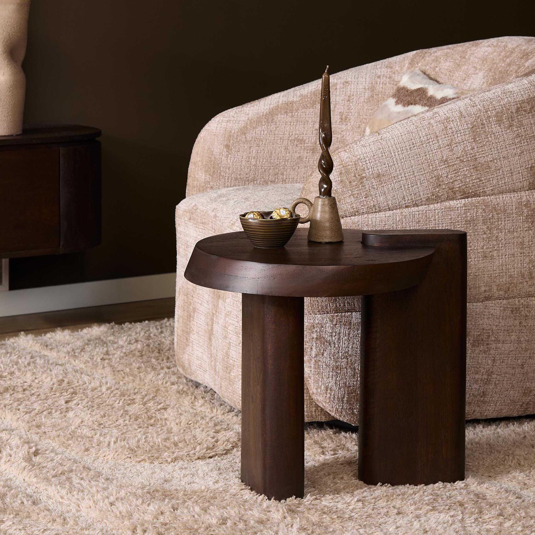 Bijzettafel Rava is gemaakt van mangohout in de kleur bruin. Het ronde blad rust op twee brede poten die samen zorgen voor een stabiele constructie. De tafel heeft een compact formaat en is daardoor eenvoudig te plaatsen naast een bank of fauteuil.