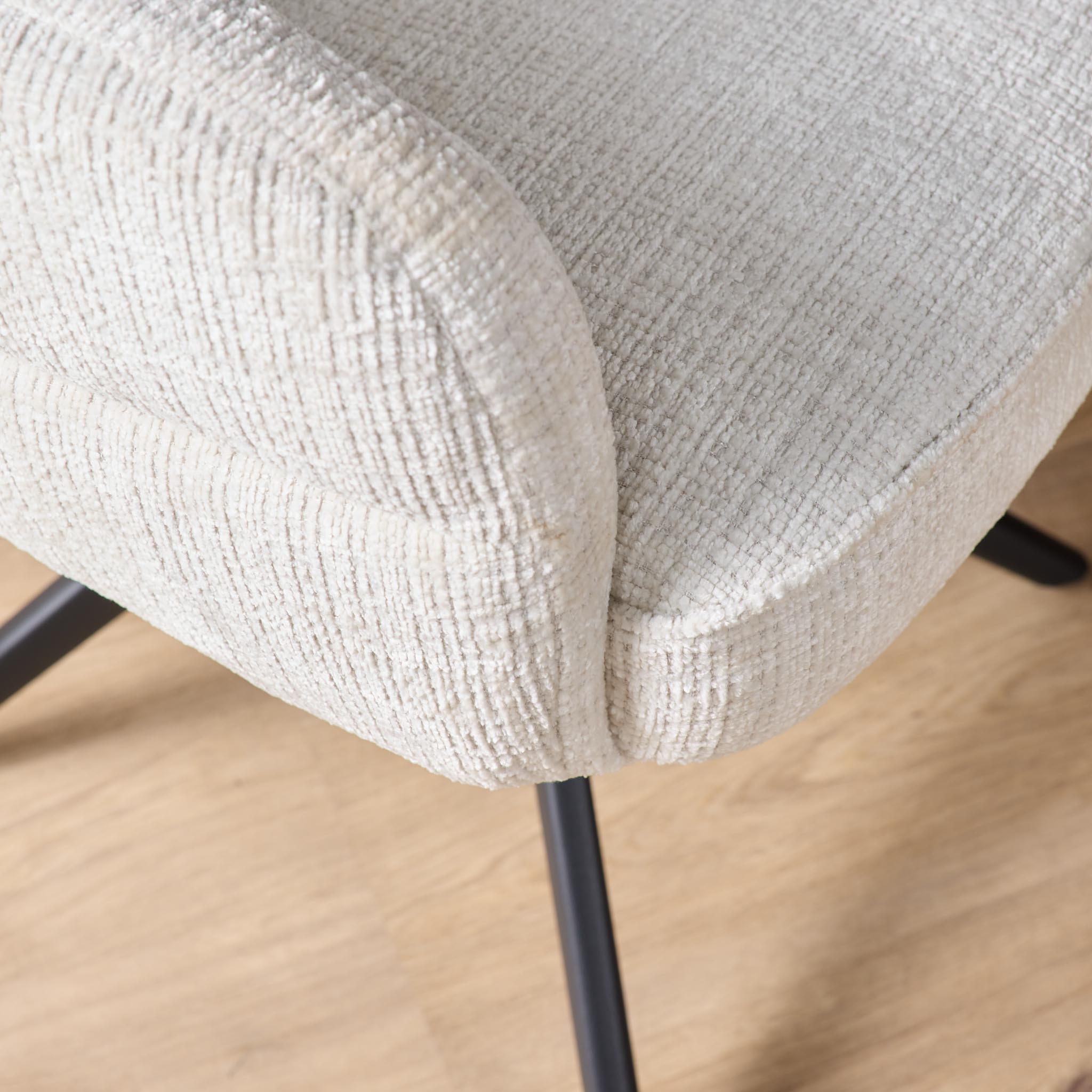 Eetkamerstoel Bella is uitgevoerd in een offwhite stof en heeft een metalen onderstel in de kleur black. De stoel is voorzien van armleuningen, een draaibare zitting en een auto-return mechanisme. De combinatie van de lichte bekleding en de zwarte poot zorgt voor een modern contrast, terwijl de afgeronde rug met subtiele banen aan de achterzijde het ontwerp extra karakter geeft.