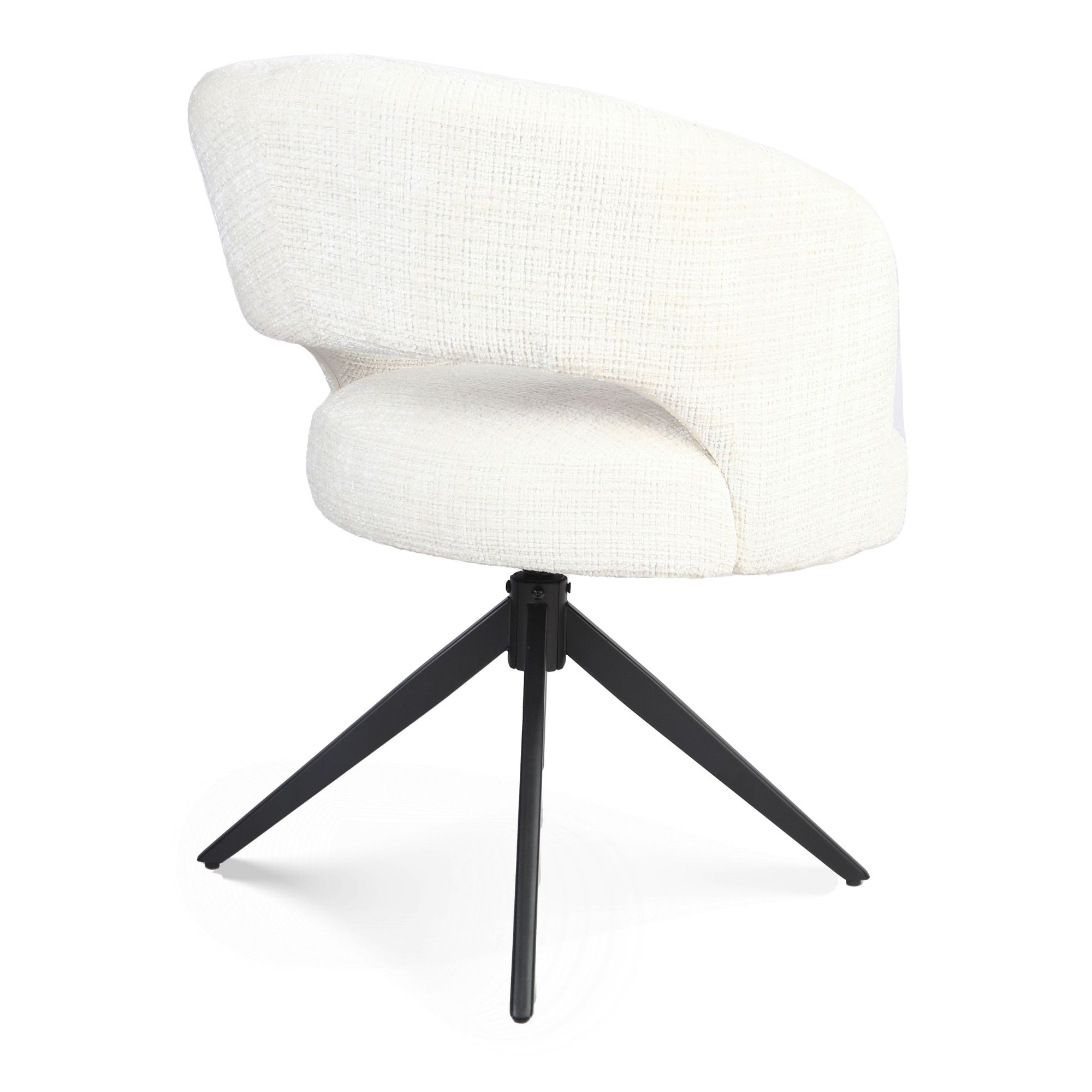 Eetkamerstoel Demi in off white heeft een metalen onderstel in de kleur black. De stoel is voorzien van comfortabele armleuningen en een zachte stoffering die zorgt voor een aangenaam zitcomfort. De warme beige bekleding in combinatie met de zwarte poot geeft de stoel een elegante en moderne uitstraling. Dankzij de afgeronde vormen van de zitting en rugleuning heeft het ontwerp een rustige, tijdloze look die moeiteloos past binnen verschillende woonstijlen. De eetkamerstoel is draaibaar.