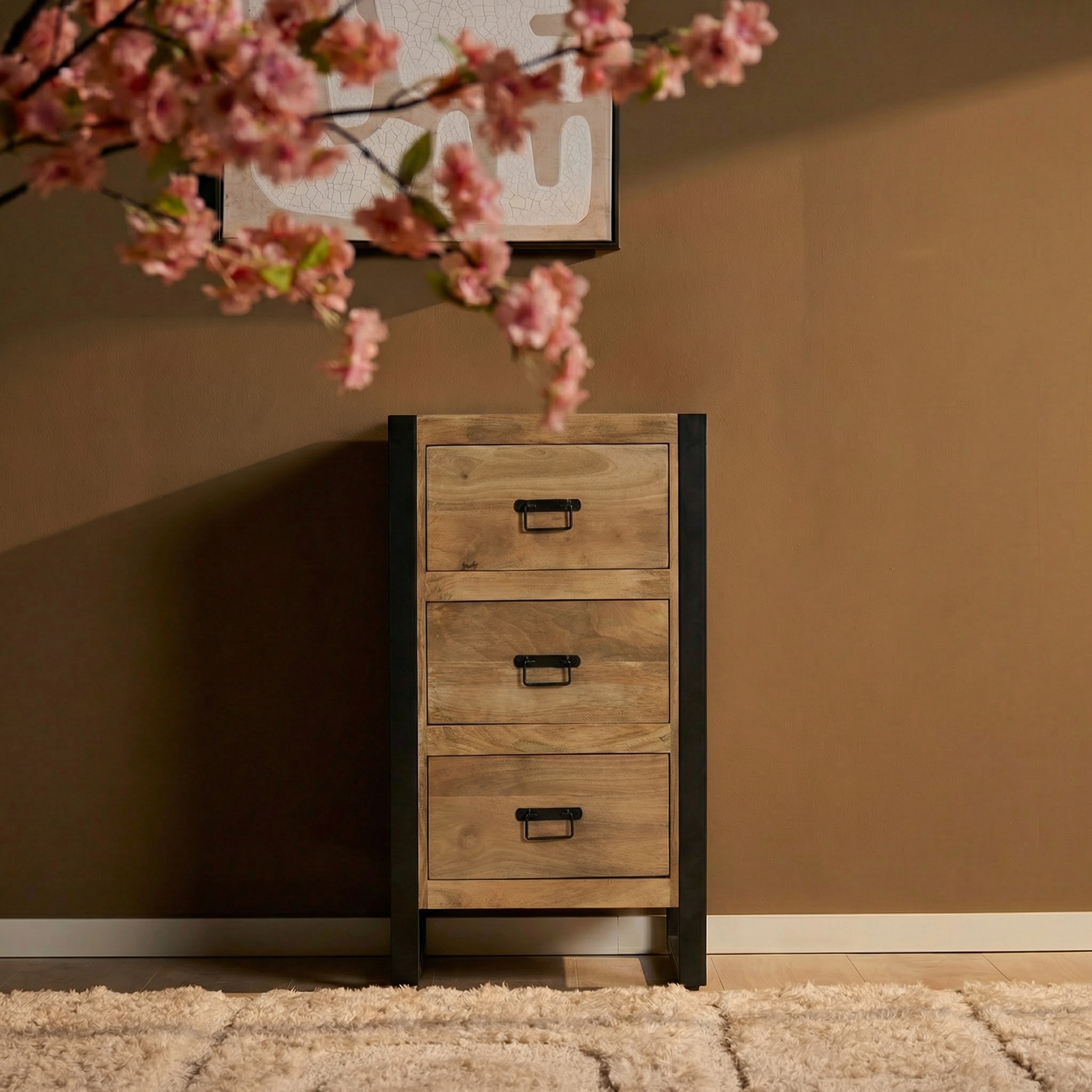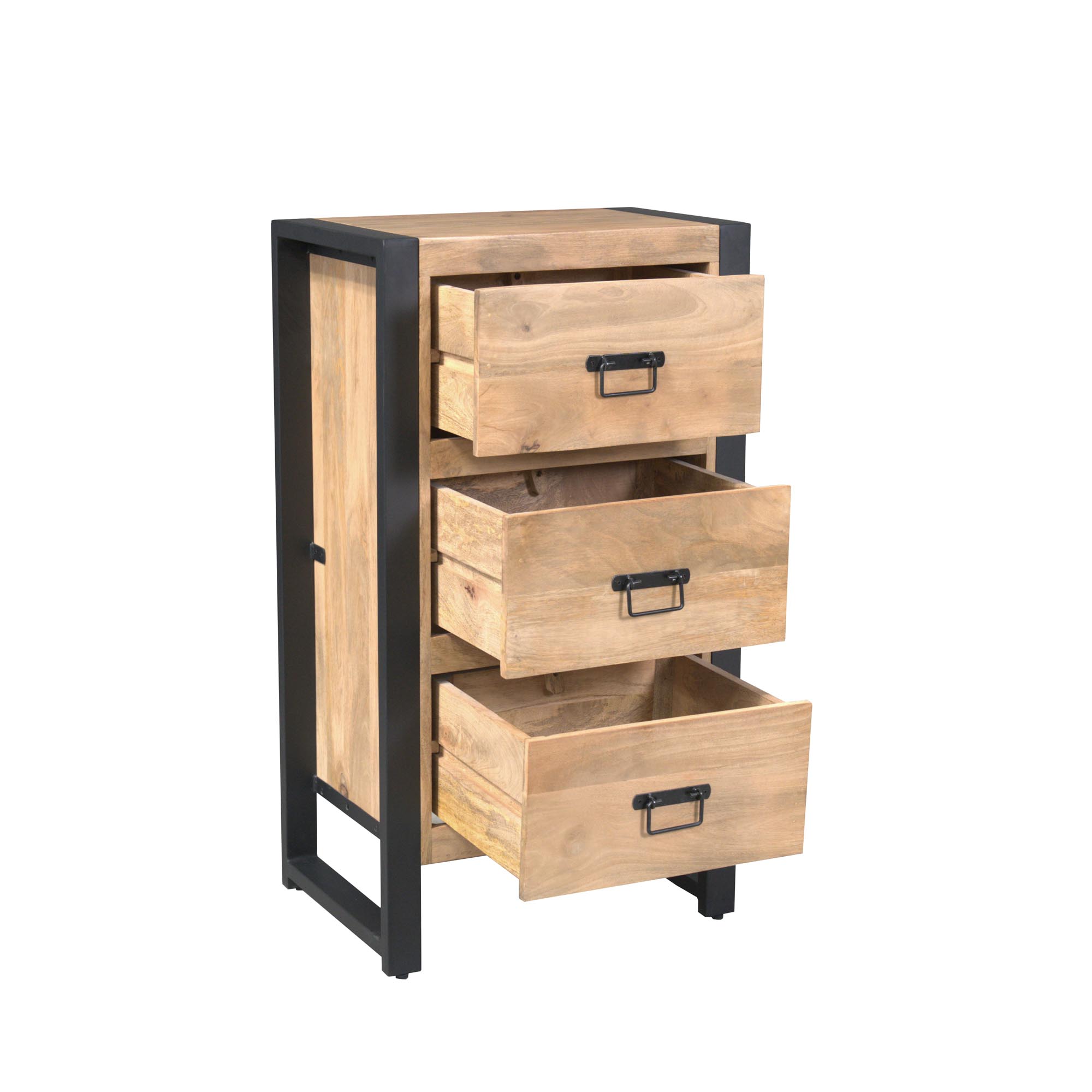 Halkast Britt combineert de van mangohout met een lichte finish met stoere zwarte metalen accenten. Deze compacte kast met drie lades biedt praktische opbergruimte en voegt een industriƫle touch toe aan het interieur.