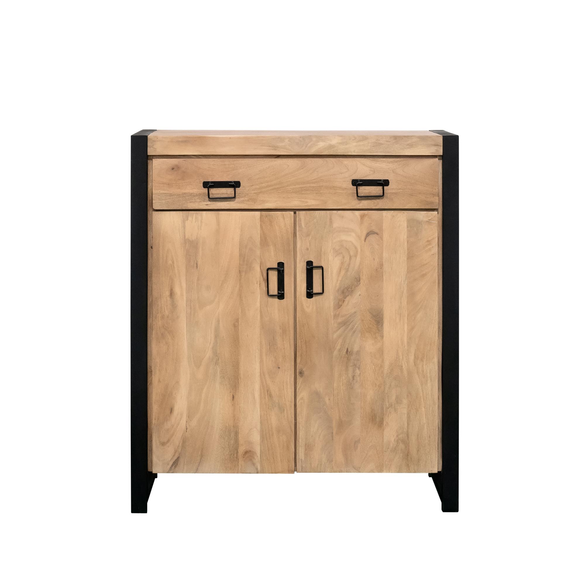 Kabinet kast Britt is gemaakt van massief mangohout. De kabinet kast heeft twee deuren en één lade. Het massieve mangohout is behandeld met een lichte finish. Het zwart metalen frame en de metalen handgrepen zijn afgewerkt met een zwarte lak.