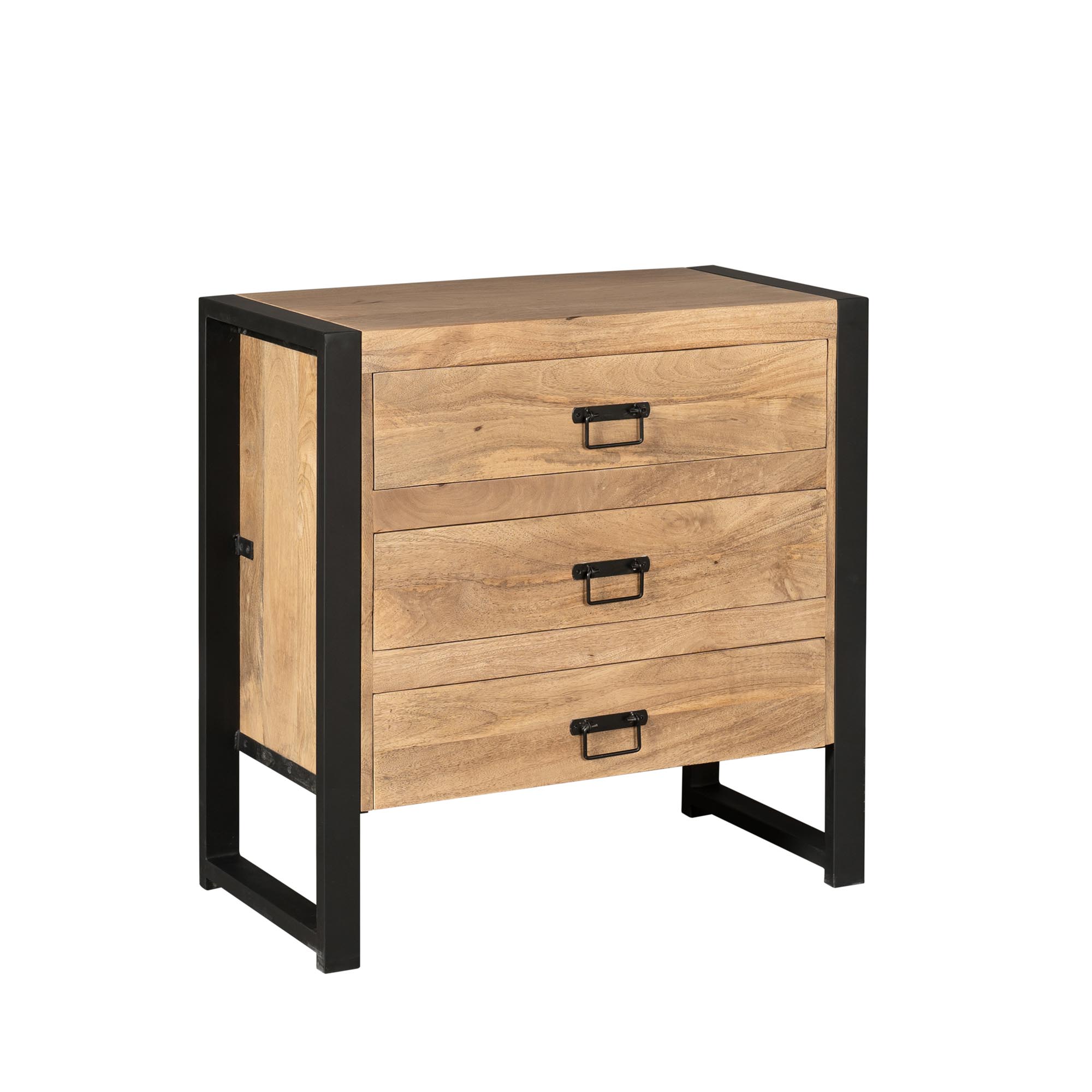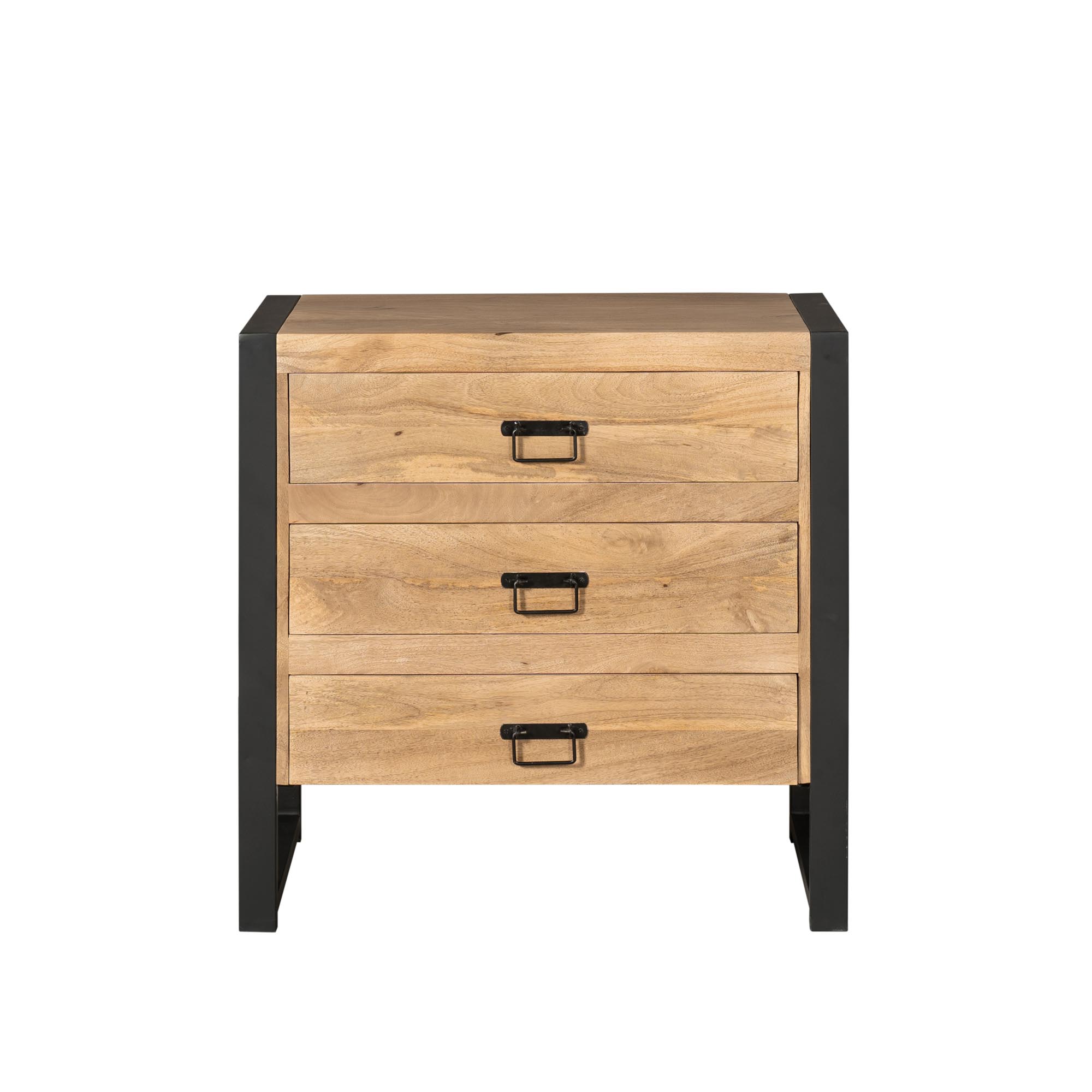 Ladenkast Britt wordt uitgevoerd in mangohout met een lichte finish. Het metalen frame en de metalen handgreep zijn afgewerkt met een zwarte lak. Dit model is voorzien van drie lades. De ladenkast is ingelegd met verschillende stroken hout, waar het meubel zijn eigentijdse karakter aan te danken heeft.