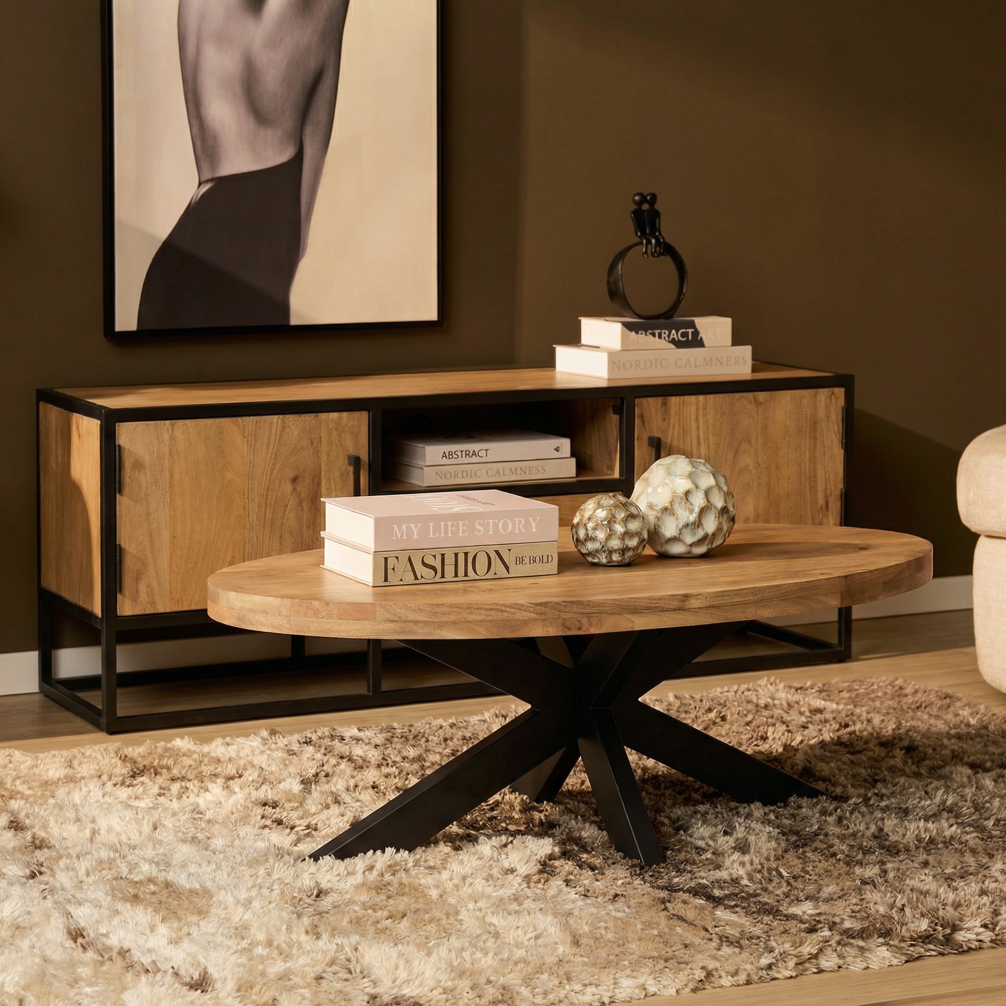 Salontafel Dakota is een stoere en stijlvolle toevoeging aan je interieur. Het ovale tafelblad van mangohout met een lichte finish zorgt voor een natuurlijke uitstraling. Het stevige metalen onderstel geeft de tafel een industriƫle touch. Perfect voor een eigentijdse woonruimte!