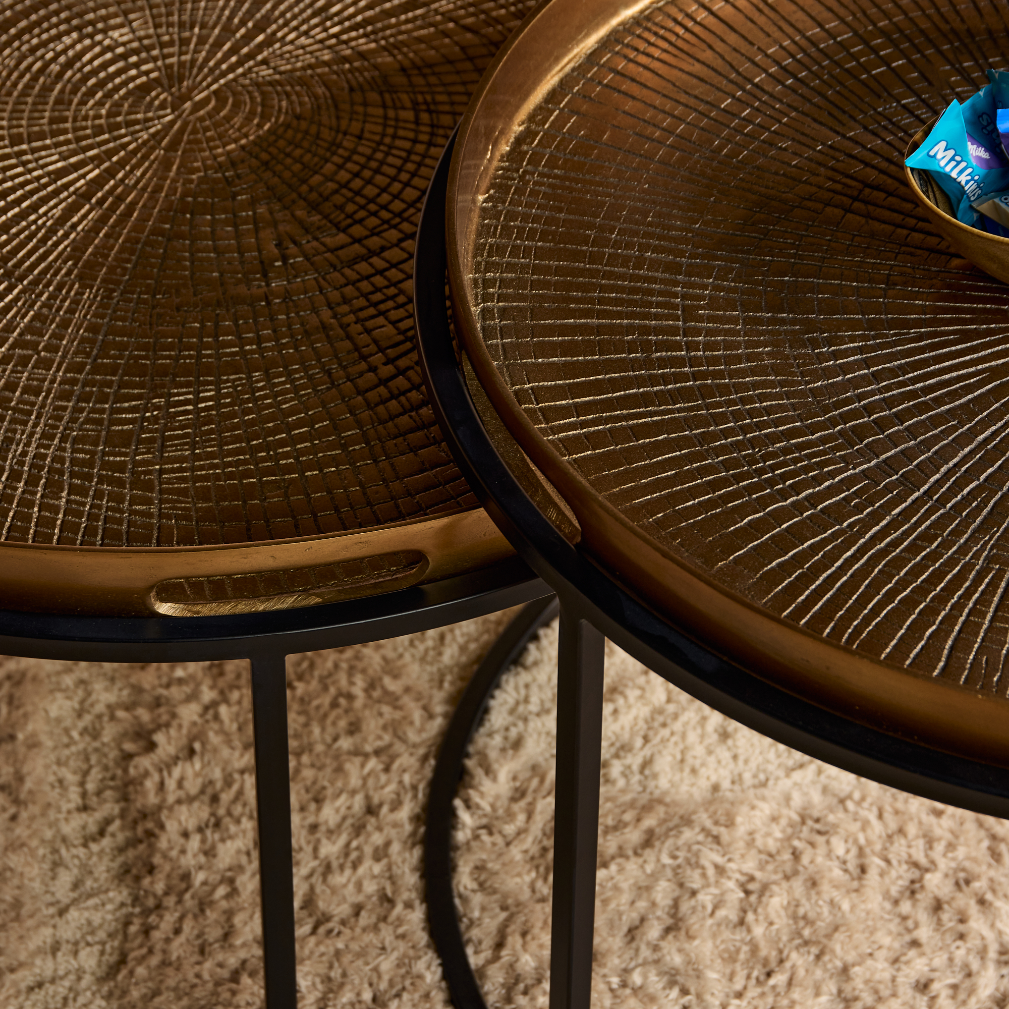 De salontafelset Julie van Starfurn bestaat uit twee tafels met een elegant en praktisch ontwerp. De tafelbladen zijn gemaakt van aluminium met een stijlvolle koper kleur, wat een warme en luxe uitstraling geeft. Deze set van twee tafels is ideaal voor zowel kleinere als grotere ruimtes.