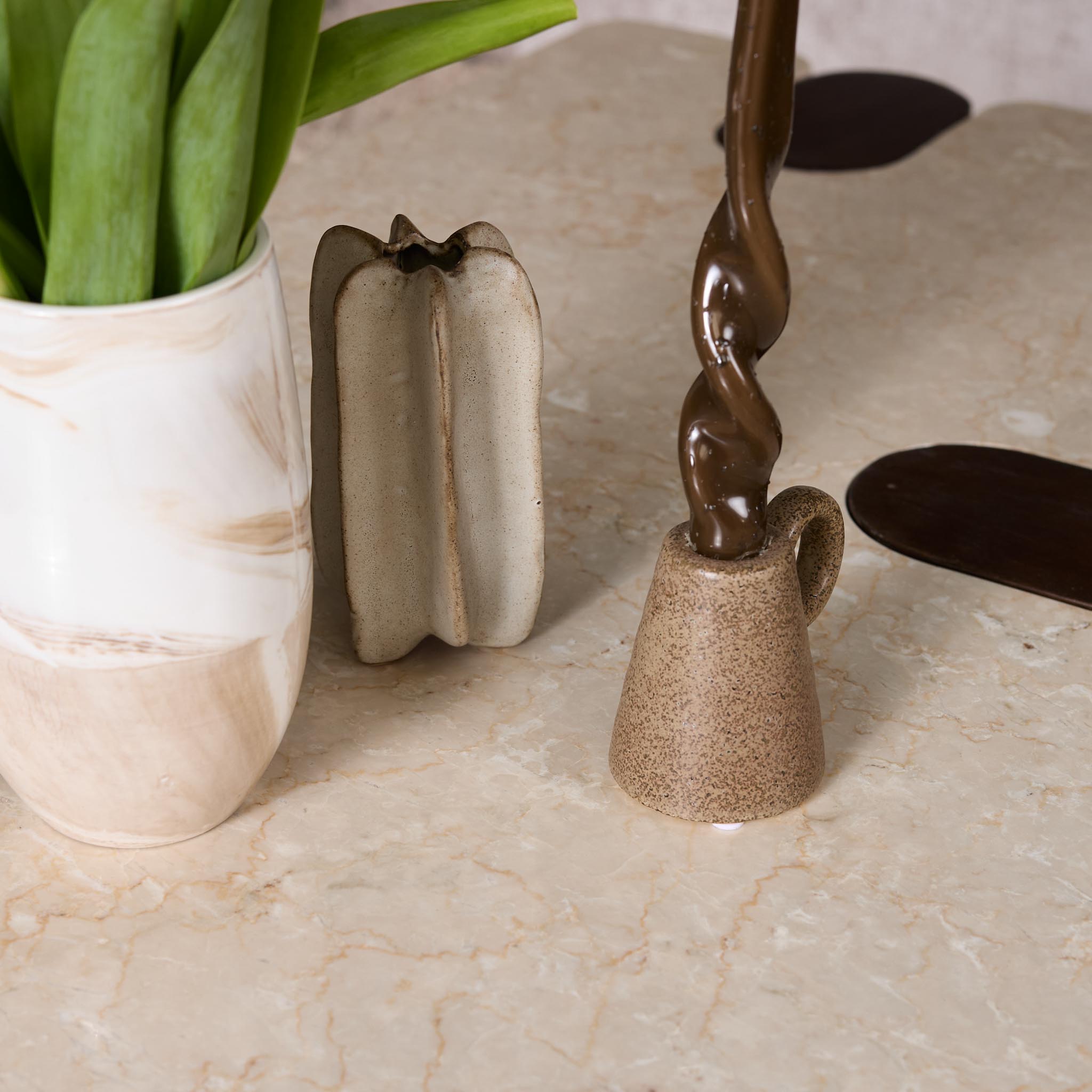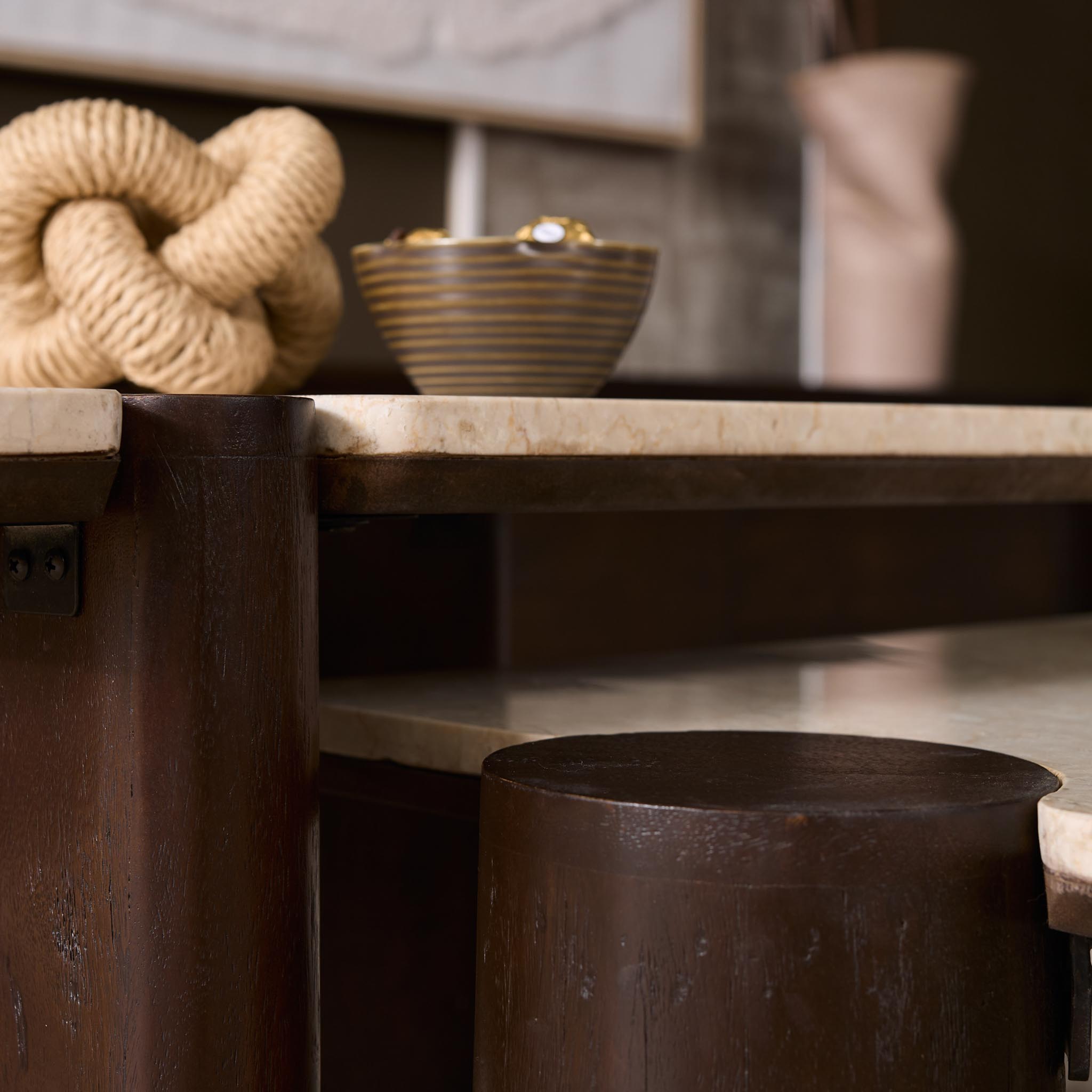 Salontafel Maeve is gemaakt van marmer en mangohout in de kleur bruin. Het ontwerp combineert een strak marmeren blad met houten poten, wat zorgt voor een modern en evenwichtig geheel.