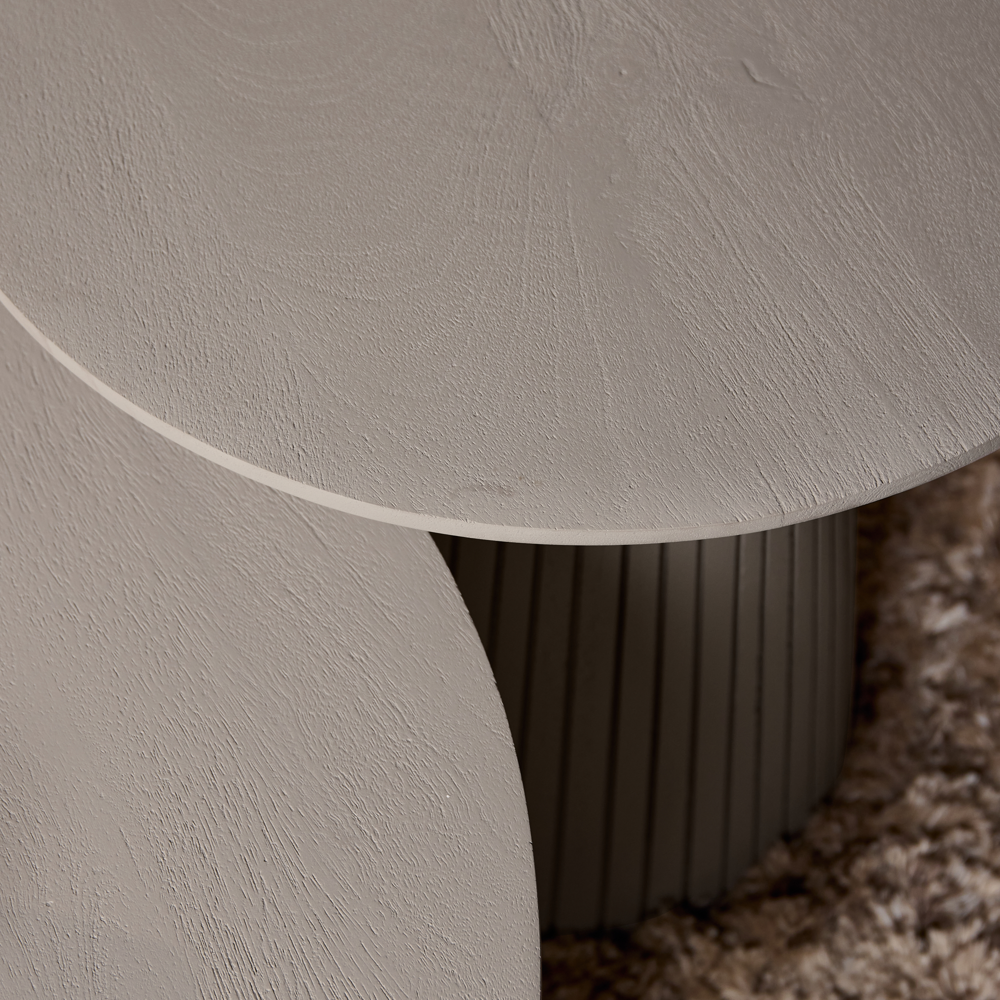 Salontafel Solana is een stijlvol en tijdloos item, gemaakt van mangohout in een taupe finish. Het ronde blad en de poot met verticaal lattenpatroon geven een moderne uitstraling. De salontafel is perfect te combineren met andere items uit de Solana serie.