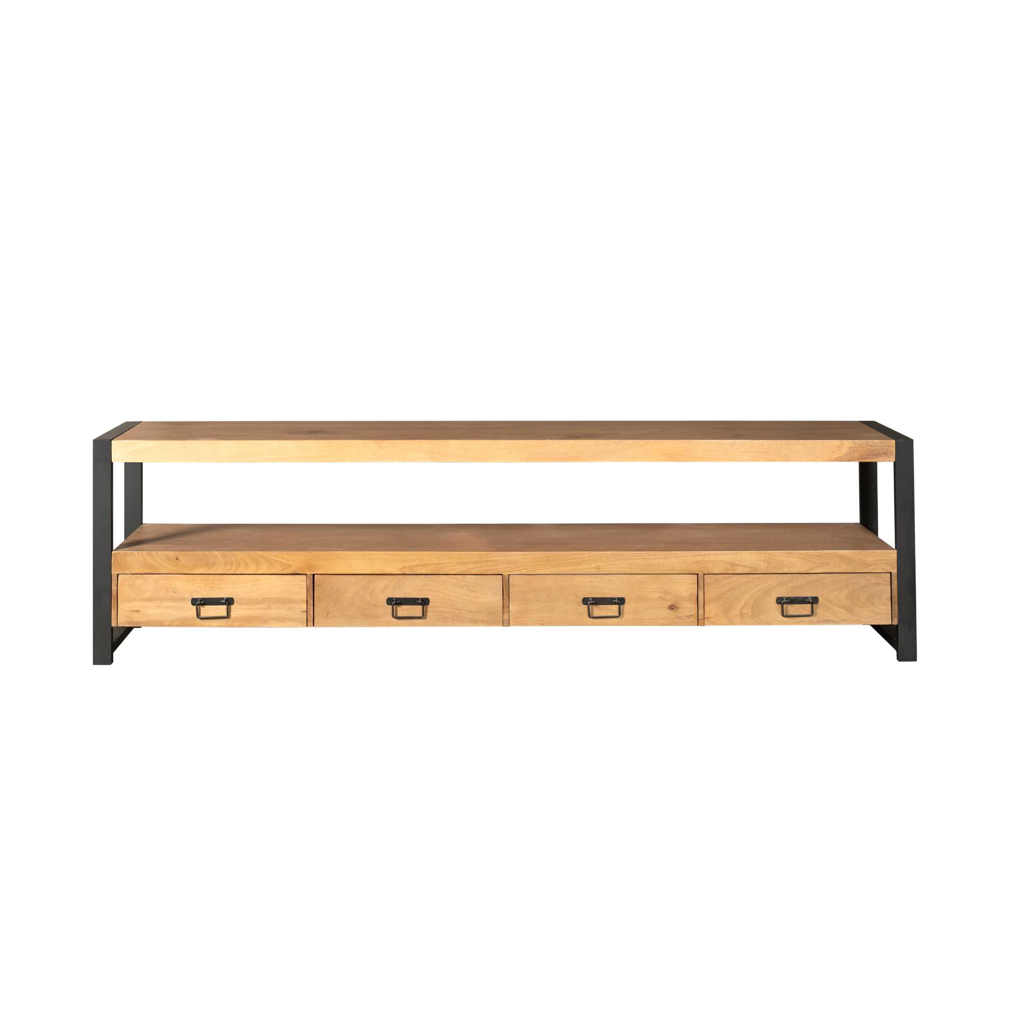 Tv meubel Boaz is uitgevoerd in het mangohout. Het metalen frame en de metalen handgrepen zijn afgewerkt met een zwarte lak. Dit model is voorzien van vier laden en een open vak. Het tv-meubel is ingelegd met verschillende stroken gelakt hout, waar het meubel zijn eigentijdse karakter aan te danken heeft.