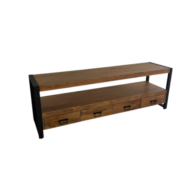 Tv meubel Boaz is uitgevoerd in het mangohout. Het metalen frame en de metalen handgrepen zijn afgewerkt met een zwarte lak. Dit model is voorzien van twee laden en een open vak en is behandeld met een warme finish.