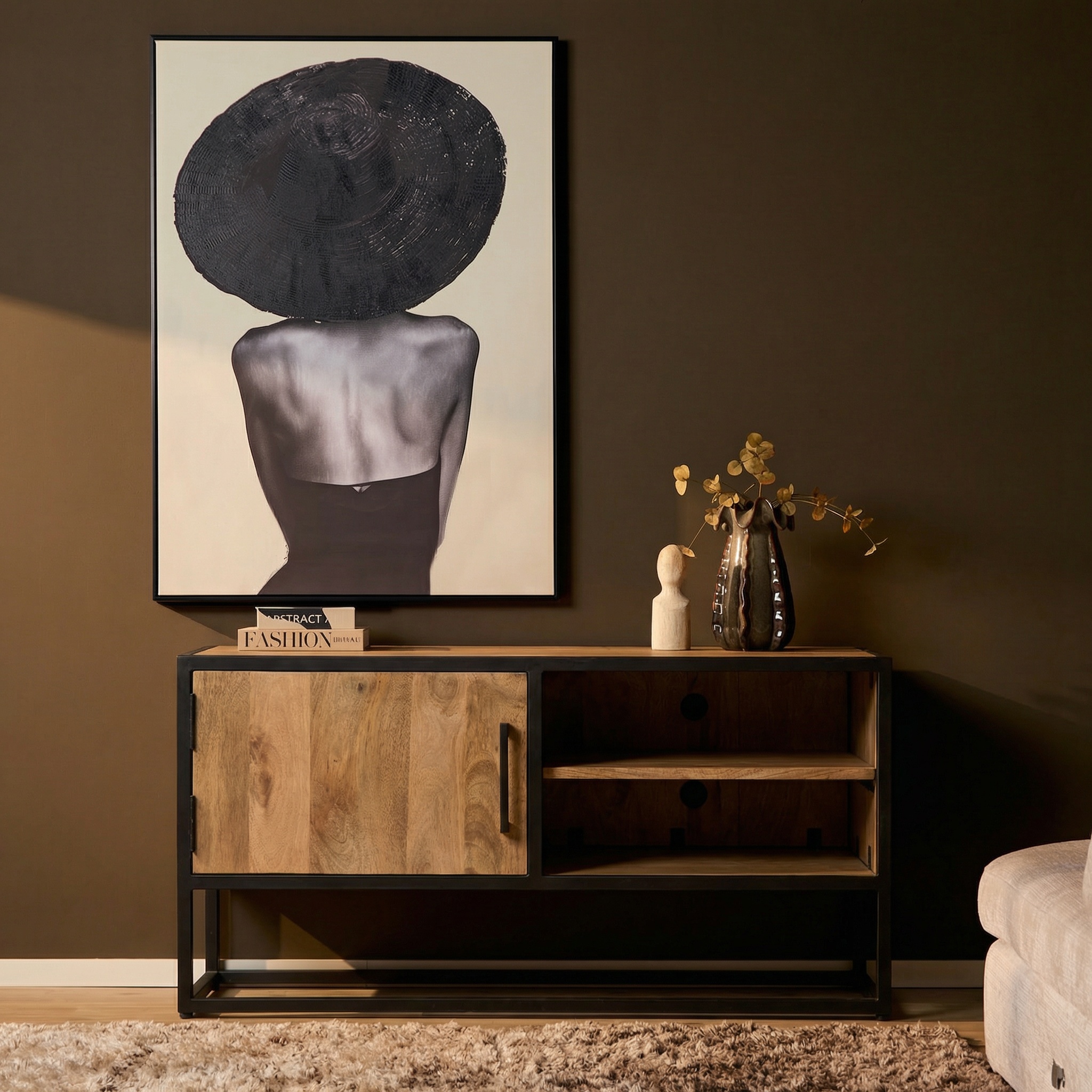 Tv meubel Dakota is uitgevoerd in mangohout met een lichte finish in combinatie met een zwart gelakt metalen frame. Dit model is voorzien van één deur en een open vak met legplank. Het tv meubel is ingelegd met verschillende stroken hout, waar het meubel zijn eigentijdse karakter aan te danken heeft.