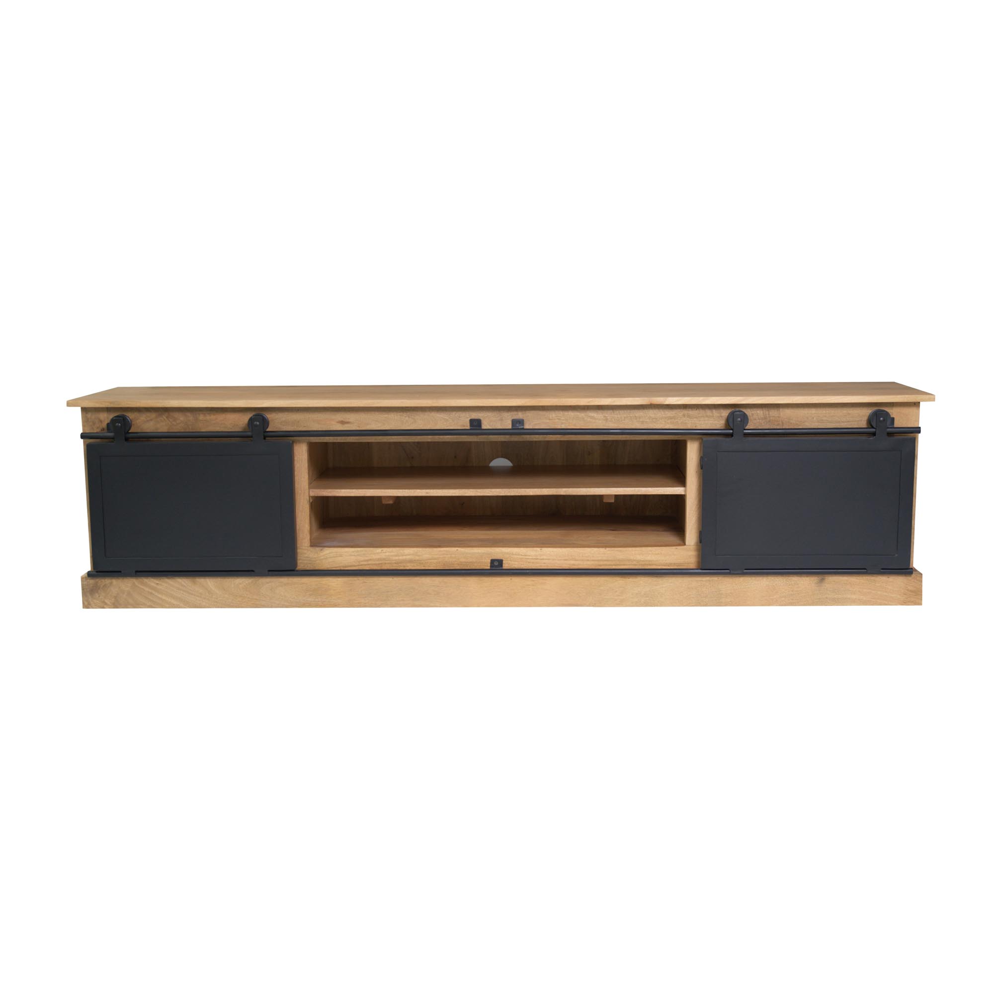 TV-meubel Fresno is een stijlvolle combinatie van mangohout met een lichte finish en zwart metaal. Het natuurlijke hout en de zwarte details geven dit meubel een stoere, warme uitstraling die perfect past in elk modern interieur.
