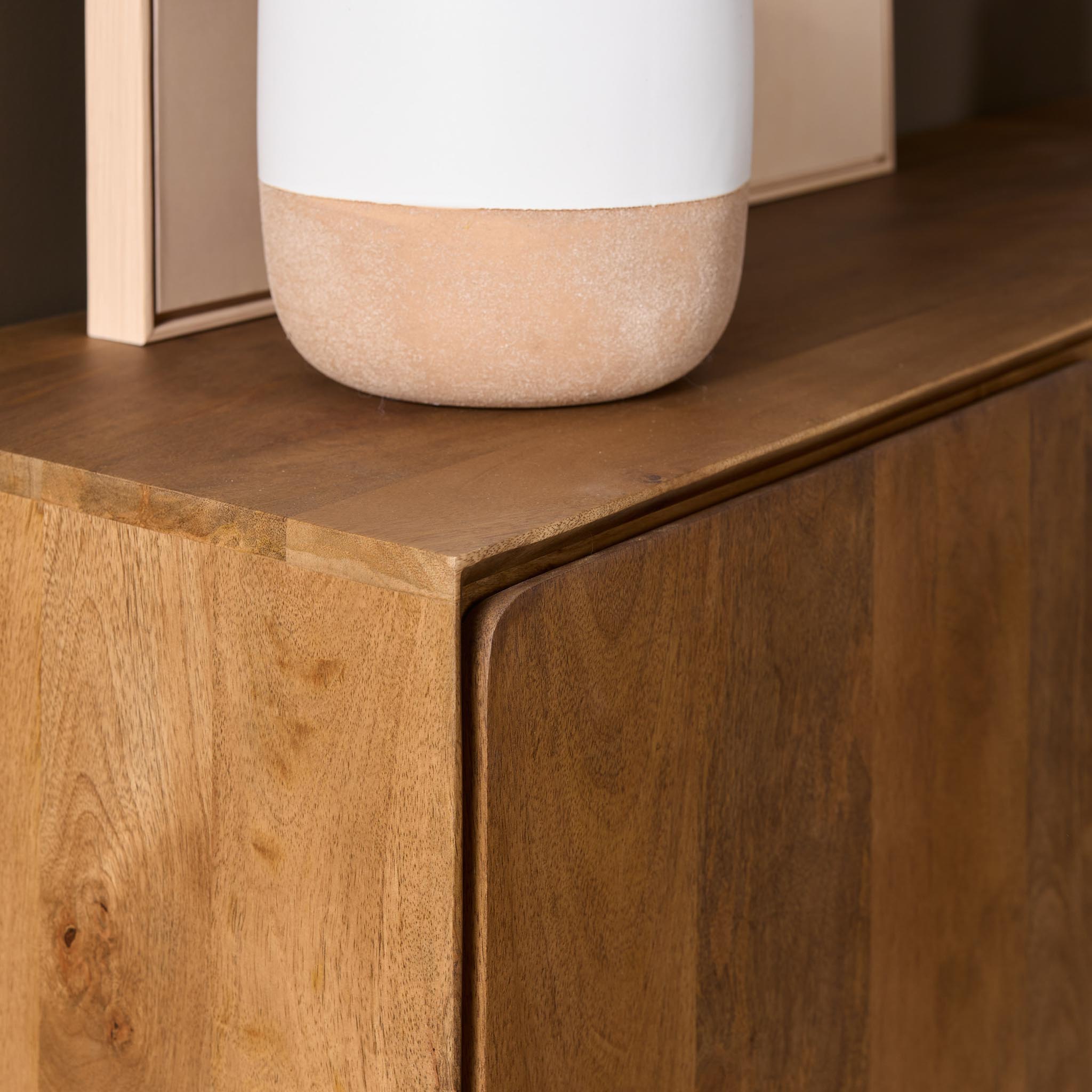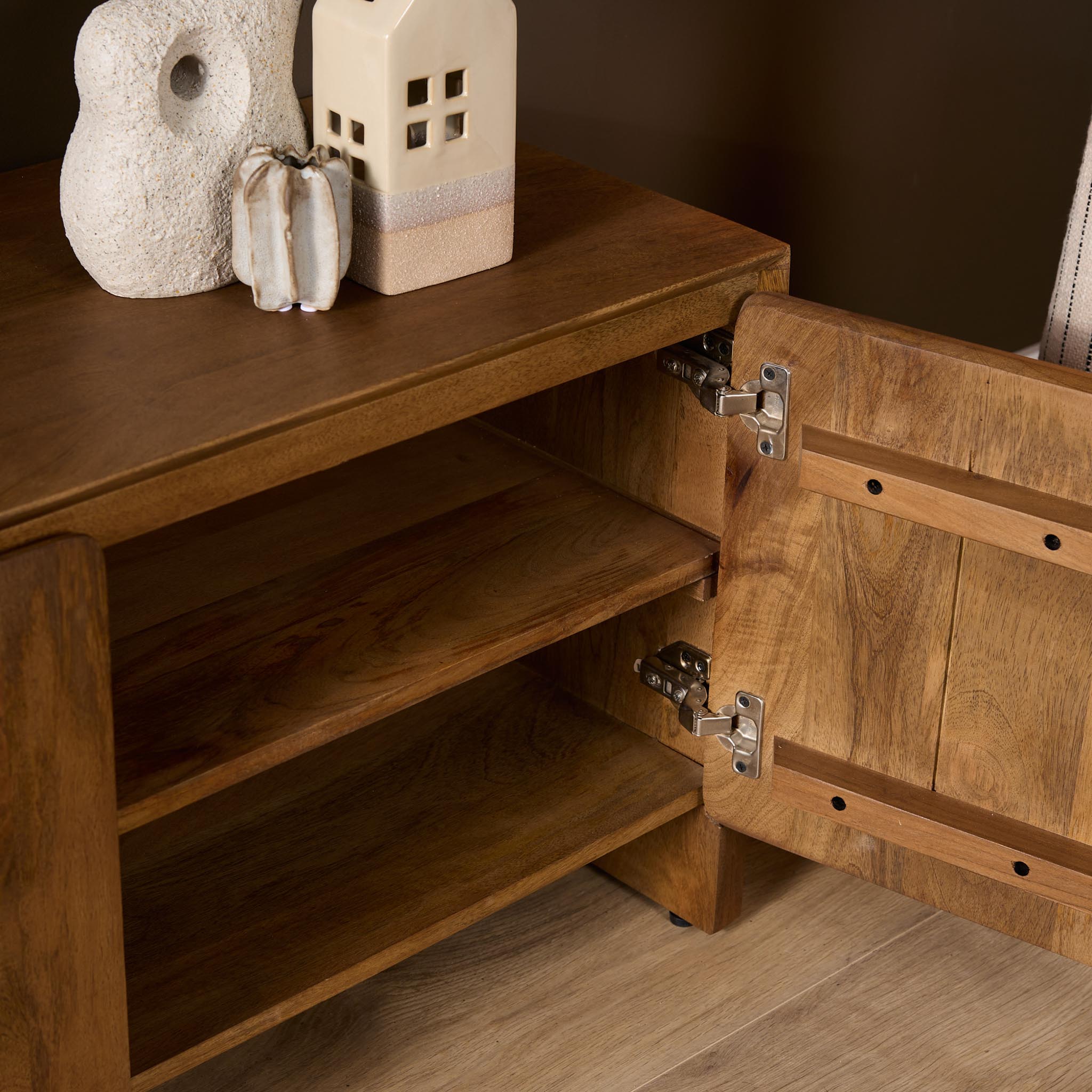 TV meubel Tense is gemaakt van stevig mangohout en straalt natuurlijke warmte uit. Met vier ruime kastdeuren en praktische planken aan de binnenzijde biedt het volop opbergruimte en past dankzij het strakke, minimalistische design in elk interieur. Een stijlvolle en praktische toevoeging aan je woonkamer!