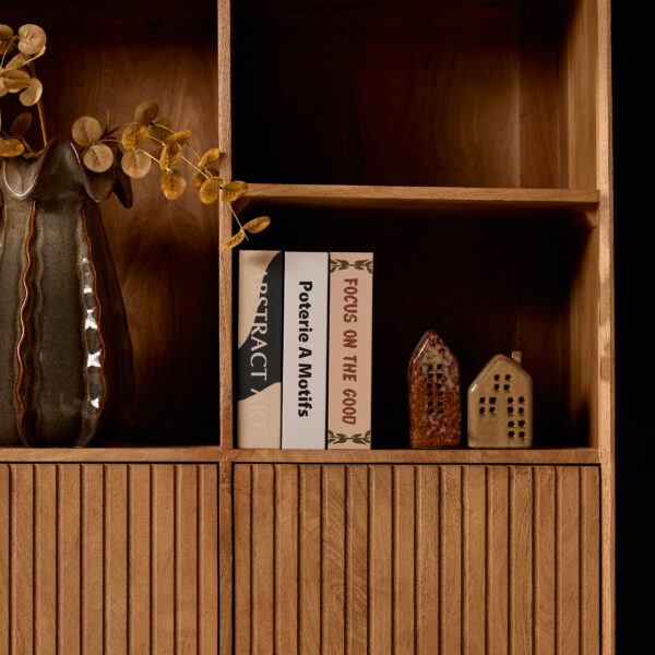 Vakkenkast ‘Madison’ Natural is gemaakt van mangohout. Dit model is voorzien van zes deuren en vijf open vakken, wat zorgt voor voldoende opbergruimte. De deuren zijn voorzien van een verticaal lattenpatroon, wat de vakkenkast een moderne uitstraling geeft.