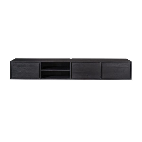 Ontdek het stijlvolle tv-meubel Ambiance Black, gemaakt van mangohout. Het zwevende ontwerp schept een gevoel van ruimte in de woonkamer, waardoor een luchtige en open sfeer ontstaat. Met een keuze uit verschillende afmetingen en kleuren, past het zwevende tv-meubel Ambiance perfect in elke interieurstijl. Dit tv-meubel is voorzien van twee open vakken en drie greeploze lades.