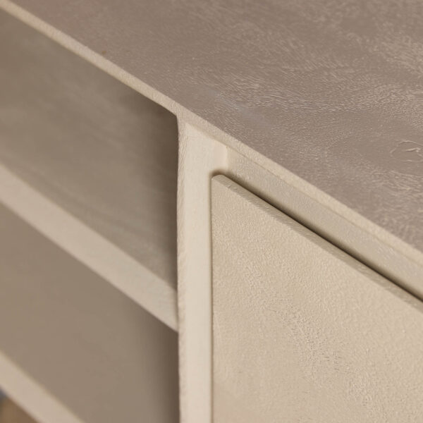 Ontdek het stijlvolle tv-meubel Ambiance Sand, gemaakt van mangohout. Het zwevende ontwerp schept een gevoel van ruimte in de woonkamer, waardoor een luchtige en open sfeer ontstaat. Met een keuze uit verschillende afmetingen en kleuren, past het zwevende tv-meubel Ambiance perfect in elke interieurstijl. Dit tv-meubel is voorzien van twee open vakken en drie greeploze lades.