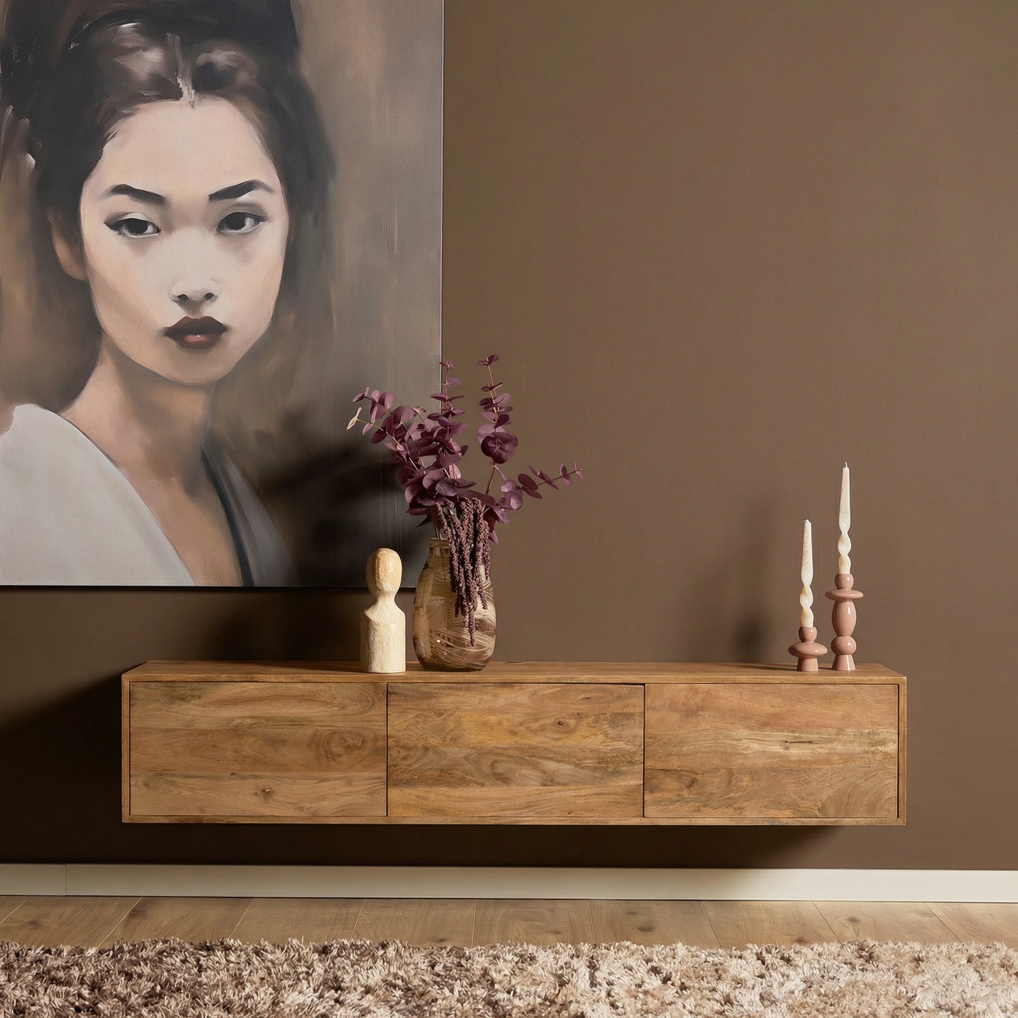 Zwevend tv meubel Vision is gemaakt van massief mangohout afgewerkt met een lichte finish. Het model kenmerkt zich door zijn strakke uitstraling en is greeploze deurtjes. De deurtjes zijn voorzien van een push to open systeem.